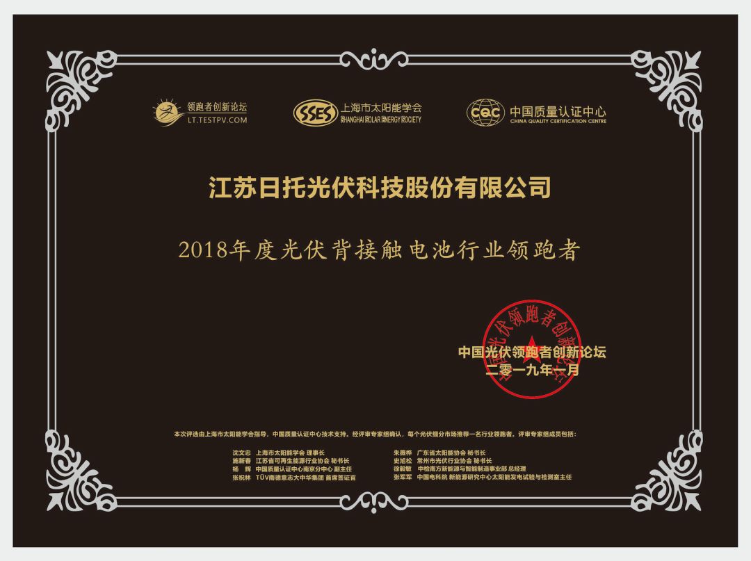 1月15日,第三届光伏领跑者创新论坛年会暨全球光伏行业领跑者峰会在江苏常州盛大召开。作为高效组件领域的领跑企业,日托光伏应邀出席,并折桂2018年度光伏背接触电池行业领跑者奖。